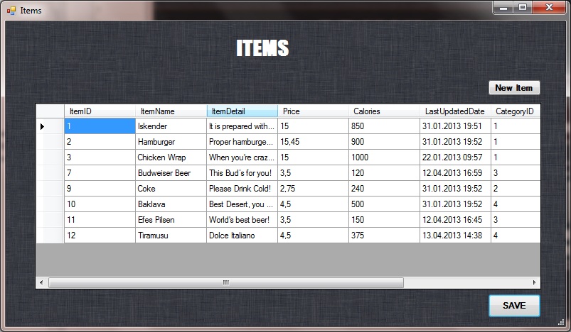 This screen allows to user adding, deleting and editing items and items details , which are in restaurant menu and will be shown in Ipad, which customers use. Item Detail screen is related to Item Page. If user clicks new item or edit item buttons , this screen will be popped up. It allows to user adding, editing item detail information.