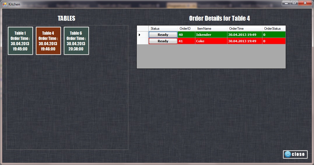 When customer is done with ordering, components in the order and their prices is seen on the screen which is located in front of the cashier with table number. When customer wants to check from Ipad, his check request warns the cashier with a ring tone. When cashier clicks table button, contents of order and total price is seen on the screen. After closing table process, table is free again.