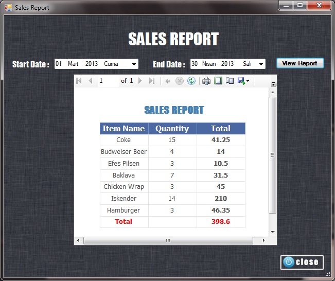 This report shows items which are ordered in date range which is specified by user. It shows items, their quantities and total prices. So user sees total money which was earned.