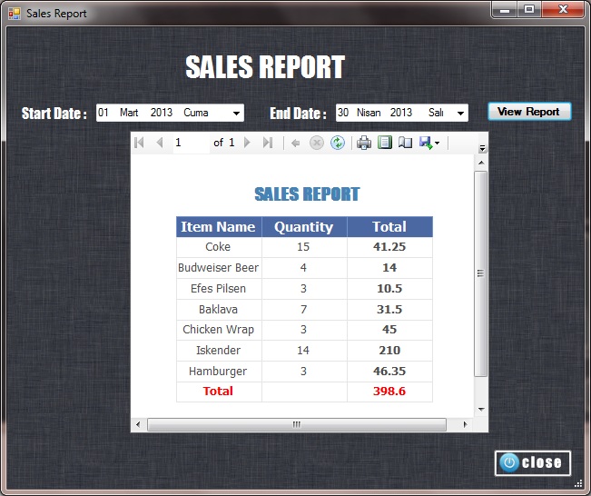 This report shows items which are ordered in date range which is specified by user. It shows items, their quantities and total prices. So user sees total money which was earned. |