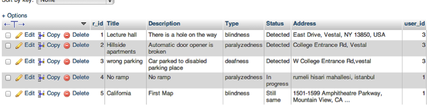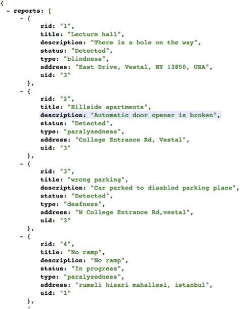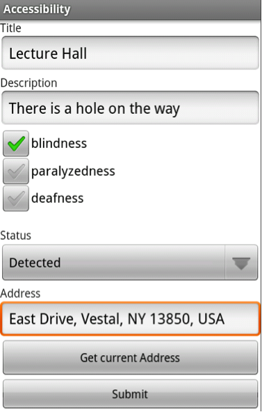 - Report violation : User can report violation by typing Title, Description, Type, Status and Address. If location of violation is in Vestal, application automatically sends e-mail to ssd[at]binghamton.edu