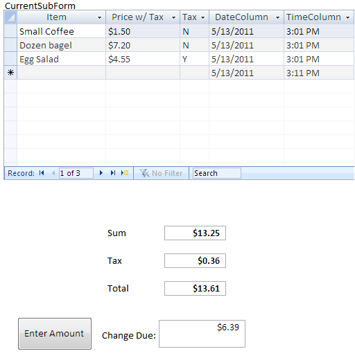 The current order appears in CurrentSubForm. The total price without tax is calculated and shown as Sum. According to the Taxable field value, the tax is calculated and shown as Tax. When enter amount is clicked a new keyboard form opens and change due is calculated.