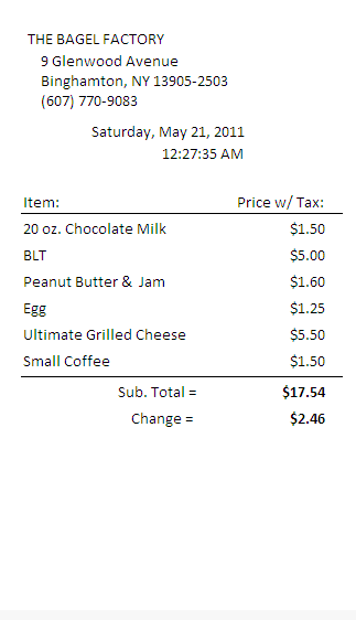 The Bagel Factory is a small sized corporation in Binghamton, NY. It is an established quick service restaurant on Binghamton's West Side.Mr. Rick Frisbie and his team produces delicious bagels. They make bagels from scratch and bakes them on site daily for their retail location, as well as for whole-scale customers throughout the area. Currently the Bagel Factory uses a standard electronic cash register, with multiple programmable options, as its Point Of Sale system. The owner of The Bagel Factory, Mr. Frisbie, wants to standardize the process of Point of Sale, use technological developments and take a step in his business for future expansion. He is looking to upgrade the Point of Sale to a touch screen unit with customizable reporting capabilities.