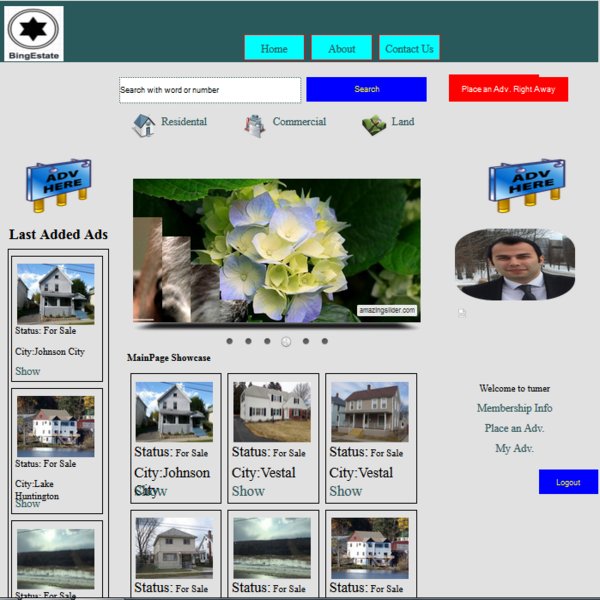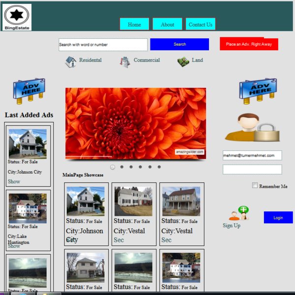 In terms of the amount of code written in total, this week was the least important one since it required some slight modifications on the main page and its some sections. After we were done coding the Logic Tier of the default page of BingEstate, the main page started displaying some ads with their images under the name of 'Mainpage Showcase'. The written code also does the operation of displaying a welcome message to the particular user on the right side of the website after he/she logs in to the system. Besides that, we coded the default.aspx.cs so that the last three added ads could show up on the leftmost side of the main page. Apart from all of these, we were told in the previous meeting that social media buttons of BingEstate such as Facebook and Twitter shall have referred to some search results of real estate agencies in the U.S., on their websites. Some changes regarding that made. Some other modifications also made for 'Home', 'About' and 'Contact Us' as well. Finally, required changes and unit testing made on the default.aspx.cs, Master.aspx.cs, About.aspx.cs and Contact.aspx.cs source files. The followings are examples of the main page without login, the main page after login and Contact page on the website.