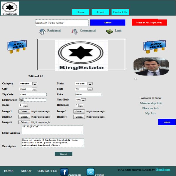 Throughout this week, we dealt with the functionality of placing an ad and putting it into the user's 'My Ads' panel. That's the two of fundamental capabilities of a registered user on BingEstate. We coded this part the way that when users place their ads, they would show up on their 'My ads' page. Besides that, registered users also can edit their ads and listings they posted before. As elaborated before, users are unable to place ads unless they are registered, Required changes and unit testing made on the corresponding Place.aspx.cs and MyAds.aspx.cs * source file also to conduct this on the Logic Tier. The following is an example of how to place an ad and accordingly it appears on the user's 'My Ads' panel.