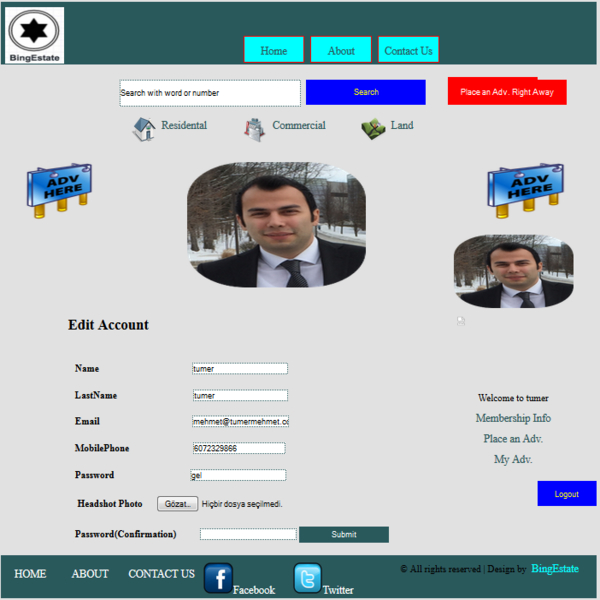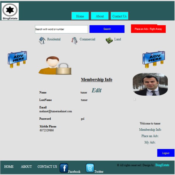 After completion of coding the first two tiers (Database and Graphical User Interface), we moved on to starting to code the Logic tier acting as an intermediary layer in between the user interface and the database. As we mentioned earlier, users are not allowed to place ads or post detailed listings unless they are a member of BingEstate. So, we must have started coding the sign-up part of the system together with a panel enabling users to be a member of BingEstate on the main page, typing some credentials. Accordingly, they would be able to start harnessing the website. After having coded this part only, it was also coded the way that their membership info would include their credentials, those credentials could be edited them, and their current ads could be shown on another section if placed any. Required changes and unit testing made on the signup.aspx.cs and Membership.aspx.cs source files. The followings are examples of the signup, membership info and membershp-info-edit pages respectively.