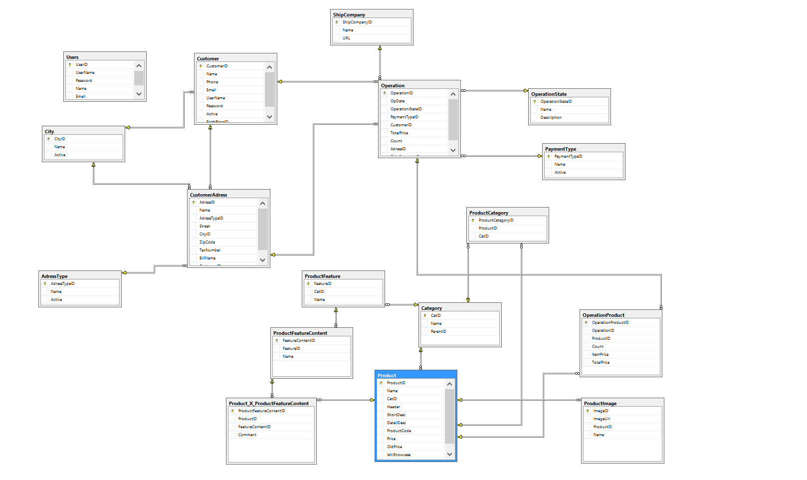 Product table holds product names, its category Id, header, short description, detailed description, product code, price, old price, a flag to show in home page and the number of products as stock. Therefore, while creating a product I use all those and assigned feature and its related contents.