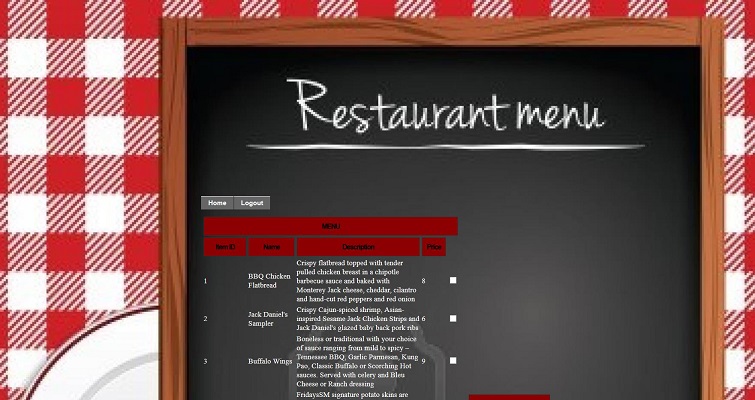 Restaurant main page directs user to menu page when the user clicks menu link. It shows the menu item id, name, description and price info of the menu items belonging to that restaurant. It also allows user to add new item into restaurant menu entering new item name, description, price and uploading menu item photo.