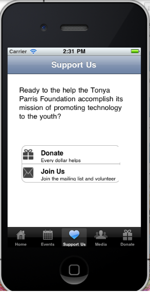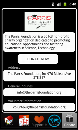The Parris Foundation Mobile application is an application designed to run on an Android and iPhone Operating Systems. Navigation between screens is done with tabs.