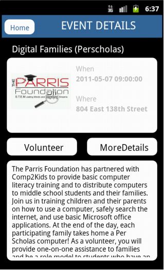 Event Details: When an event is selected event details screen shows up with more details. Also a Volunteer button provides user to view the event in EventBrite web page, ability to attend to the event and become a volunteer. At the bottom of the page there is info about foundation as well.