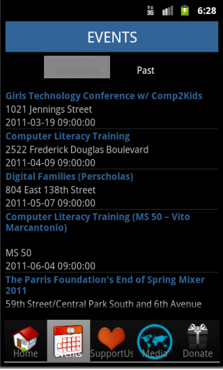 Main is the interface holding links to other tabs. Basically, it has five tabs: "Home", "Events", "Support Us", "Media", "Donate". When application starts home tab is opened as default. Featured event, a picture provided by The Parris Foundation and the latest tweet are displayed on the screen. For getting event and tweet EventBrite and Twitter APIs are used. When featured event is clicked, the user is redirected to the event details page to display details of the event.