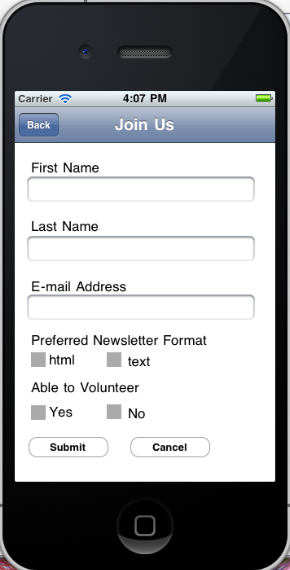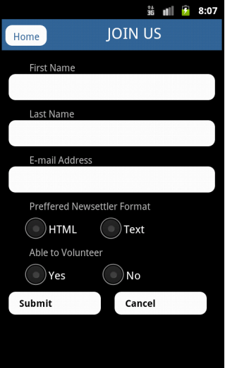 Join Us page does not work properly. In this page first name, last name and e-mail address textboxes, radio buttons for selecting preferred newsletter format and ability to volunteer are provided. The Parris Foundation uses MailChimp for handling subscriptions. MailChimp has ChimpKit APIs for both Android and iPhone. In Android platform it makes subscription with only user name, last name and the e-mail address but does not return a confirmation message after submit button is clicked. IPhone API does not work at all.