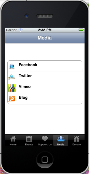 Through media page user can access "Facebook", "Twitter", "Vimeo" and "Blog" pages of the foundation. These pages are displayed in a web view using their URLs.
