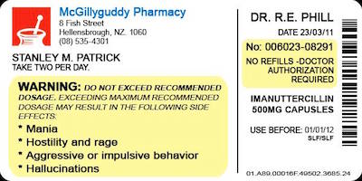 - Manufacturer of the drug: Manufacturers name and adress is stored on the pill bottle. This information inside to return the bottle to the correct adress.