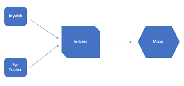 - I should talk about the design of the wheelchair. The movement direction is generated by two input sources, either the eye tracker software or joystick. It is deigned like