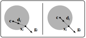 vector di and the gradient vector gi do not have the same orientation thus we can say that di is not at the centre yet. But on the right