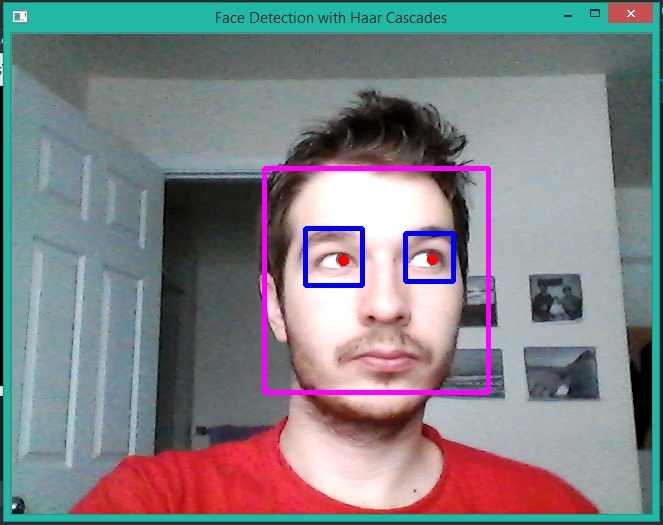 - Currently my program calculates the central point of the boxes that surround the eyes within the face found. What I will be