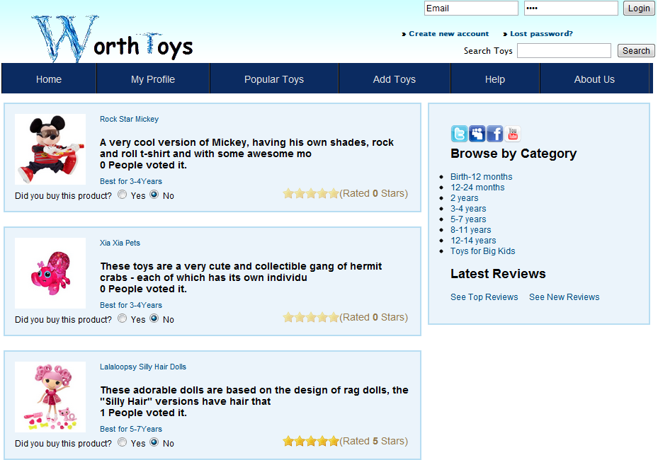 Worthtoys is a website for people where they can find toy and reviews about them. It has a really easy user interface. People can reach toys which they are looking for. They can also add toys which they have tried or experienced before.