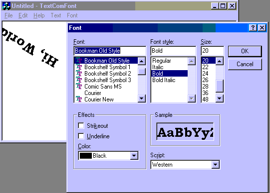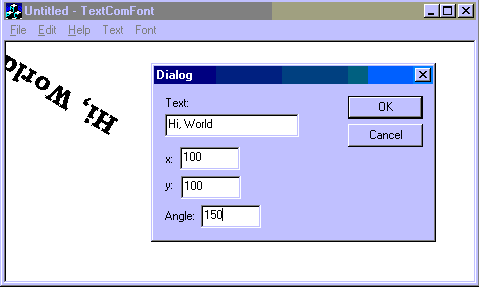 Stroke fonts- Consist of line/curve segments Continuously scalable Slow to draw Legibility not good Raster fonts- Bitmaps Scaling by non-integer scaling factors difficult Fast to display Legibility very good TrueType fonts- Rasterized stroke fonts Stored as strokes with hints to convert to bitmap Continuously scalable Fast to display Legibility very good Combine best of both stroke and raster fonts Device fonts- Native to output device (e.g., built-in printer fonts). Using stock fonts-- Access with GetStockObject(); Returns a handle to a font Select into DC with SelectObject(); Using Logical Fonts- Can specify and create your own "Custom" font from available font files In MFC, Font specification/creation is encapsulated in the CFont class Two ways of using it: (1) Call CFont::CreateFont(), passing 14 font description parameters (2) Describe the font with a LOGFONT sturcture & pass ptr to that structure in a call to CFont::CreateFontIndirect() In each case, use SelectObject(&fnt) to select new font into the DC CreateFont() can make new fonts by interpolating data in a font file New sizes, bold/underlined, rotated/distorted characters Called logical since generated by program logic CFont fnt; fnt.CreateFont(Ht, Width, Escapement, Orientation, Weight, Italic, Underline, StrikeOut, CharSet, OutputPrecision, ClipPrecision, Quality, PitchAndFamily, Facename); Heights and average Widths--measured in logical units Default logical unit of a screen DC: pixels Escapement--Angle, in tenths of a degree, between line through the origins of first and last characters on a line and the x-axis of the screen surface Orientation--how much a character should be rotated, in tenths of degree (900 == character is lying on its back)