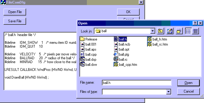 Use AppWizard to create a Dialog-based application template: File/New/MFC AppWizard(exe), name it FileComDlg Step 1: choose "Dialog based " Step 2 of 4: deselect "ActiveX Controls" Step 3 of 4: accept defaults Step 4 of 4: accept defaults Finish/OK Delete the "TODO" static control in the dialog box template Add the following Controls to the dialog box template: "Open File" Button (IDC_OPEN) "Save File" Button (IDC_SAVE) "Text:" Static Control A Large multiline Edit control (IDC_EDIT, style: multiline) Add private variable m_sFileName to the CFileComDlgDlg class Type: CString (Right click on CFileComDlgDlg class) Use ClassWizard to attach m_string variable to the Edit Control: In CFlilComDlgDlg class, Control ID: IDC_EDIT: Variable name: m_string, Category: Value, Type: CString Use ClassWizard to add button-clicked Message Map handler functions to each button for the CFileComDlgDlg class: IDC_OPEN: BN_CLICKED -- OnOpen() IDC_SAVE: BN_CLICKED -- OnSave() Add following code to the OnOpen() function: // TODO: Add your control notification handler code here FILE *fp; int nFileLong; CFileDialog m_ldFile(TRUE); //Construct for reading if (m_ldFile.DoModal() == IDOK) //Start File dlg box { m_sFileName=m_ldFile.GetPathName(); //Get file name fp=fopen(m_sFileName,"rb"); //Open file for reading fseek(fp,0,SEEK_END); //Go to file end nFileLong=ftell(fp); //Get length char* sText = new char[nFileLong+1]; //reserve string space fseek(fp,0,SEEK_SET); //Go to file start int i=fread(sText,1,nFileLong,fp); //Read the characters sText[i]=0; //Set string terminating null m_string=sText; //Put text in Edit box's variable fclose(fp); //Close file UpdateData(FALSE); //Force data to go to Edit control } Add following code to the OnSave() function: // TODO: Add your control notification handler code here FILE *fp; int nFileLong; UpdateData(TRUE); //Force data from Edit box to variable CFileDialog m_ldFile(FALSE); //Construct for writing if (m_ldFile.DoModal() == IDOK) //Start file dlg box { m_sFileName=m_ldFile.GetPathName(); //Get file name nFileLong = m_string.GetLength(); //Length of text in Edit box fp=fopen(m_sFileName,"wb"); //Open file for writing fwrite(LPCTSTR(m_string),1,nFileLong,fp); //Write text to file fclose(fp); //Close file } Build and Run the Application Try opening (reading) arbitray text file on system Try saving resulting text to a new file Try typing in text Note: To get a carriage control, use <Ctrl> <Enter> Try deleting/cutting/pasting Part of built-in Edit control functionality
