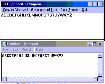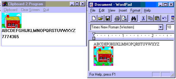"Clipboard | Copy to Clipboard" Three types of data sent to clipboard: Some text using CF_TEXT format A bitmap image using CF_BITMAP format Some custom-format data "Clipboard | Get clipboard Text" Retrieve and display text from clipboard "Clipboard | Get clipboard BMP" Retrieve and display bitmap image from clipboard "Clipboard / Get Special Data" Retrieve and display custom-format data from clipboard After using CLIP2 "Copy to Clipboard", try the following: 1. Use Windows Notepad and "Paste" Gets text since Notepad supports only CF_TEXT format 2. Use Windows Paint application and "Paste" Gets bitmap since Paint reads and writes CF_BITMAP 3. Use Windows WordPad application and "Paste" Get text since WordPad considers CF_TEXT "preferable" to CF_BITMAP But use WordPad and select "Paste Special" Can choose either text or bitmap Delayed Rendering of Clipboard Data-- Many clipboard data formats Memory space could be wasted if all formats are sent to clipboard App can "send" data without including the data Send just the format Pass NULL as data block handle in SetClipboardData() Windows "remembers" active window handle when clipboard opened Subsequent clipboard read attempts App's WndProc() must provide data of specified type For example, data supplier program does the following: OpenClipboard (hWnd); EmptyClipboard (); SetClipboardData (CF_TEXT, 0) // delayed rendering of CF_TEXT data CloseClipboard(); When any app subsequently tries to read clipboard, the following occurs: The app requests CF_TEXT data with GetClipboardData() Windows recognizes that CF_TEXT data must be loaded Windows sends WM_RENDERFORMAT msg to data supplier wParam = clipboard format code Suppler program's WndProc() calls SetClipboardData() again This time, sending the data (handle) Windows passes handle to app requesting the data But what if data supplier program terminates before data is requested? Windows sends supplier program a WM_RENDERALLFORMATS msg Sent before it terminates Program responds by sending blocks with data of all formats it supports Using the Clipboard with an Edit Control-- Edit controls have built-in cut-and-paste capability for selected text User selects text in edit control by dragging mouse cursor over text (or by using <Shift>-arrow keys) Selected text is highlighted It can be cut or copied to clipboard: Just send edit control WM_CUT or WM_COPY message Example: Copy currently-selected text in edit control with handle hEdWin-- SendMessage (hEdWin, WM_COPY, 0, 0); wParam and lParam are not used Edit control receives this message Selected text is copied to clipboard using CF_TEXT format Pasting text from the clipboard to an edit control-- Send edit control a WM_PASTE message SendMessage (hEdWin, WM_PASTE, 0, 0); If there's clipboard contains text, it's inserted into edit control at position of blinking caret Cutting text (removing it) from edit control to clipboard-- Send edit control a WM_CUT message: SendMessage (hEdWin, WM_CUT, 0, 0); Deleting text from edit control by cutting it and emptying clipboard: SendMessage (hEditWin, WM_CUT, 0, 0); if (OpenClipboard (hWnd) { EmptyClipboard (); CloseClipboard (); }