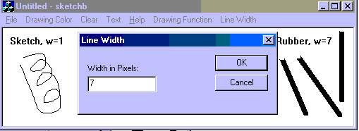 4. Add rubberband line and line width functionality to MFC Sketch app-- New menu items: "Rubberband line": allows user to draw rubberband lines "Line width": brings up dialog box with line width edit control subsequent sketches/lines will use the new line width