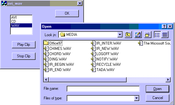 5. MFC Audio CD / AVI Movie / Digital Sound player-- A dialog-based app with following controls: Listbox with "AVI", "CD", "WAV" choices "CD" selection==>audio CD playing is selected "WAV" ==> wave file playing is selected "AVI"==>AVI video movie playing is selected "Play" and "Stop" buttons "Play" pressed==> "WAV" & "AVI"==>Common File Dlg box, selected file played "CD"==>Audio CD in CD-ROM is played "Stop" pressed==>playing stops & device is closed "OK" button to terminate