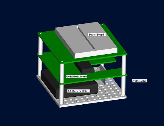 The following diagrams and pictures show what the resulting hardware platform should look like and how it should be assembled. Note that the main objective of this design is to attach a QuikFlash and QuikProto board with battery power packs to a large LEGO brick so that the entire module can be easily integrated with a robot constructed from other LEGO bricks. You will be provided with a kit that contains all the parts necessary to construct the module. Bring a screw driver and a pair of pliers with you to lab so that you can build the platform.