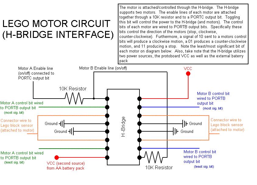 Wire the H-bridge and LEGO motors to the PIC-Brick's QuikProto board as shown in the schematic above. You will use bit-4 of Port C (RC4) as an enable line of the H-bridge. Driving this signal low will disable the H-bridge and corresponding motors. Bits 2 through 5 of PortB should initialized as output bits, and wired to the control bits of the H-bridge. Sending binary signals to these bits will control the direction of the motors’ rotation (as mentioned above). Again, take note of which bit is most significant for each motor and where it is wired. Follow the schematic to wire the remaining pins of the H-bridge, the LEGO motors lines, ground, and VCCs.
