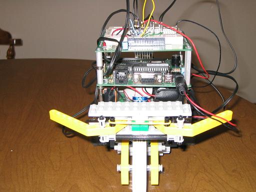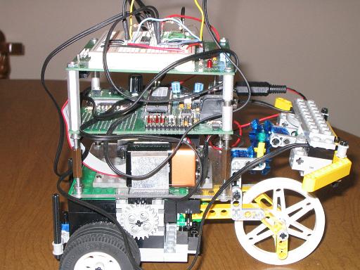 The robot you will be designing and building for this lab should be large enough to support the "PIC-Brick". It should have wheels, two of which are driven by LEGO motors, in addition to two bumper arms, each of which causes a touch sensor to be activated whenever the arm strikes an obstacle. The design is up to you, but the robot should be able to move forward, backward, and turn to the left or to the right. The bumper/touch sensor assembly should enable the robot to detect when it has bumped into an obstacle in front of it on either its right side or its left side. Your robot should be constructed in such a way that it can be easily attached to the "PIC-Brick" control module you assembled in the first part of this lab.