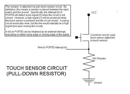 The touch sensor of the LEGO Mindstorms Robotics Invention System can be interfaced to the PIC18F452 microcontroller through a pull-down resistor circuit (Figure 2). A 10K resistor is placed between the input switch and ground such that if the circuit is not closed (touch sensor not pressed), the bit connected to the microcontroller will be low. When the touch sensor is pressed, the circuit is closed and a high signal is delivered to the microcontroller. Since activating a touch sensor means the robot has collided with an obstacle, the robot will need to interrupt its normal routine and take an avoidance maneuver. Therefore, the microcontroller must monitor the bits from the touch sensor circuits at all times. The robot will have two bumpers (touch sensors), so bits 0 and 1 of Port B will be used as an external interrupt for each sensor respectively. The following is a schematic of how the touch sensor should be connected.