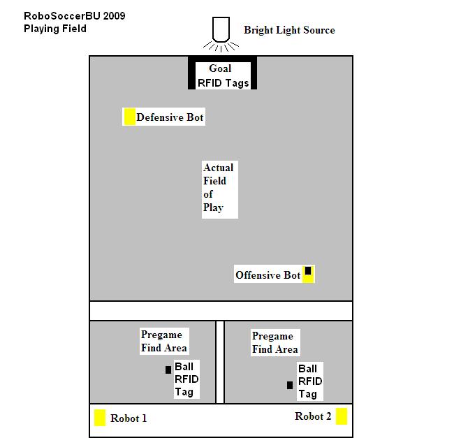 CS-424, Spring, 2009 Final Competition: RoboSoccerBU RoboSoccerBU is a game for two robots. Each team will use and program an "Open Robot" which will compete against every other team's Open Robot. The point of the game is to score as many points as possible. The robot with the highest score at the end of the game wins that game. During game play one robot is on "offense" and the other is on "defense". Only the offensive robot can score by moving into a "goal" area at the far end of the playing field. The other robot is on "defense" and tries to prevent the offensive robot from scoring by bumping into it. If that happens, the robots change roles, with the offensive robot going on defense and the defensive robot going on offense. (The referees determine if and when a bump has occurrred.) Determining defensive and offensive robots (Pre-game): The end of the playing field opposite to the goal end is divided into two equal- sized rectangular areas of a given size: the "Pre-game Find" areas. At the start of each new game and also after a point is scored by either robot, each robot is placed at one corner of one of the two rectangular areas. A specially programmed RFID tag representing the soccer ball is placed at a random position in each rectangular area by the referee. The robots are started simultaneously and the one that finds its "ball" first becomes the offensive player; the other robot becomes the defensive player. After the offensive and defensive robots are determined, they will be placed on the playing field (as shown in the diagram of the playing field shown below), started, and begin their offensive scoring strategy or defensive strategy. A Game: A game will continue until a total of 3 minutes have elapsed. After a point is scored by the offensive robot, the robots will be returned to the "Pre-game Find" area to once again determine which will be on offense and which on defense for the next round of the game. The winner of a game will be the robot that has accumulated the most points after the 3 minutes. The Playing Field: The playing field is divided into two parts: the actual field of play and the smaller "Pre-game Find" area in which the robots determine which will be on defense and which is on offense for the next round. (See the following diagram.) At the end of the actual field of play is the goal containing several RFID tags. The offensive robot can determine if it is in the goal area by detecting and reading the RFID tags. Immediately behind the goal there will be a strong source of white light that can be "seen" from anywhere on the field. The robot light sensors will be able to detect light from the light source.The Offensive Robot: The offensive robot is responsible for finding the goal and moving into it. It scores a goal any time it enters the goal area. Then it has 5 seconds to stop movement inside the goal. If it does not stop within 5 seconds, the team does not get a point and possession changes. The offensive robot should try to avoid being tagged by the defensive robot. It should also avoid running into the walls of the playing field. The Defensive Robot: The responsibility of the defensive robot is to prevent the offensive robot from scoring by bumping into it. If and when that happens the offensive and defensive robots will change roles. The defensive robot is not permitted to enter and stay more than five seconds in the goal area. If it does so, it will be penalized by having one point deducted from its score. Stopping a game: At any time any of the referees (professor, TA, robot designer) may determine that a game must be stopped. Determining the winning team: Each robot will play at least one game against every other robot. For each robot we will tabulate total number of goals scored by that robot and the number of games it won. The winner of a single game will be the robot that has scored the greatest number of goals for that game. In the case of a tie there will be no winner of that game. The final winner will be determined by a combination of most wins and most goals scored during all of the games of the competition. In other words, each will team be rated 6,5,4,3,2,1 in number of game victories and 6,5,4,3,2,1 based on total number of goals accumulated in all games. Those two numbers for each team will be added and the team that has the highest sum is the winner. Grading: In order to receive a satisfactory grade in the competition, your robot must demonstrate that it: 1. can find a light source and move in its general direction 2. can stop when it detects an RFID tag 3. has a strategy for finding the "ball" RFID tag (VERY IMPORTANT) 4. has an offensive strategy 5. has a defensive strategy 6. can recognize and stop when it has entered the goal 7. can avoid the walls of the playing field 8. can seek/avoid the other robot when on defense/offense Each team must submit a paper describing in detail the programs used to control its robot as well as the strategies used for each of the 8 points given above. The paper must be submitted by the Friday after the competition at noon. Diagrams (and/or especially photographs) as well as source code listings are an essential part of the paper. Each member of each team must also submit a numerical peer evaluation of each other team member indicating how he/she thinks the other members of the team have contributed to the overall effort and success of the team. The following is how the project grade will be determined: The paper................................................................. 30% Performance during the competition (professor/TA evaluation of how well the robot performed the eight requirements)................... 25% Final score in the competition.............................................20% Team member peer evaluations...............................................25%