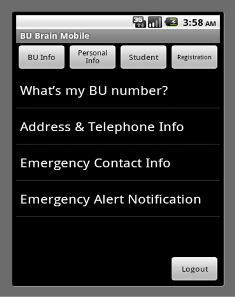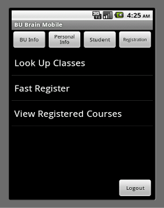 BU Brain Mobile application is an application designed to run on an Android Operating System. It makes http request to university’s server in order to access Binghamton University database. The connection is through internet connection either using wireless communication or using the service phone operator provides. Application consists of five major screens: Main screen, Bu Info screen, Personal Info screen, Student screen, and Registration screen.