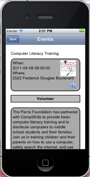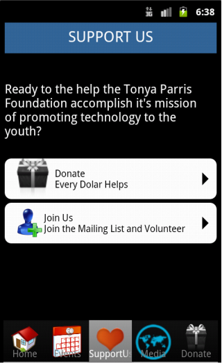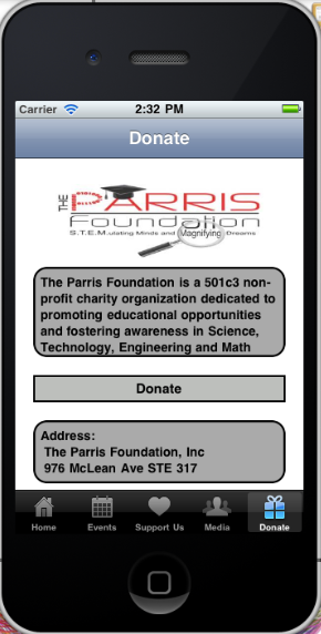 The Parris Foundation Mobile application is an application designed to run on an Android and iPhone Operating Systems. Navigation between screens is done with tabs.