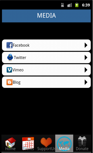 Through media page user can access "Facebook", "Twitter", "Vimeo" and "Blog" pages of the foundation. These pages are displayed in a web view using their URLs.