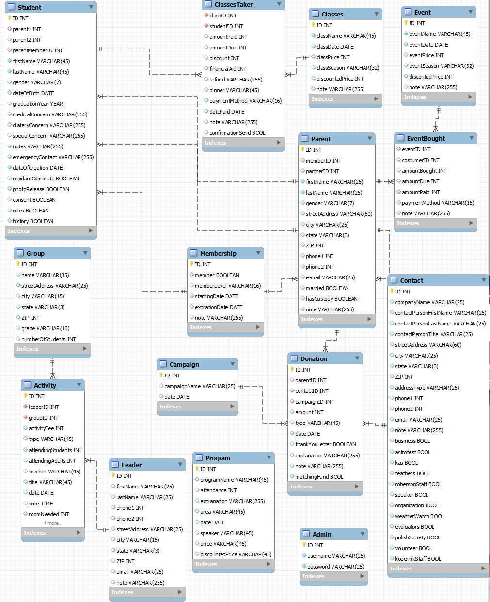 Student database is a merge of two old databases: TalentSearch and ContactManagement with several new add-ons. Basically, a student can have two parents (which shall be changed in a way that lets a student to have up to four parent, and necessary amount of grandparents, or no grandparents) in either gender. These parents may have memberships, which may or may not affect the student, or the wife. And parents may do donations, or join events, whereas students may join to classes. Moreover, Contact’s may be speakers, who may come to give a speech about some topic, or make donations, whereas donations can be done for no reason, or for a campaign.