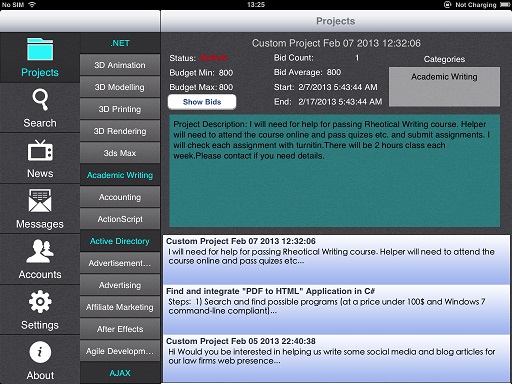 This project is intended to be a mobile application and especially just for iPad users. What we aim to do in this project is to focus on the need of an iPad application already exist as a website. Work-at-home scheme is one of the employment methods that have been around for decades. With this method, many people do their jobs in the comfort of their own homes. But there must be a way that gathers these people together and find a solution for each side both employer and employee. With the development of internet, people can easily find a job that is provided by various employers. There are many websites that aim to do this. Each of them has been focusing on the different type of employment such as in store marketing representative, business manager, product manager, graphic designer and many more. We are going to concentrate on to find a job for freelancer for the software development area such as computer programming, web design, website development and graphic design. As it is obvious, they are all related to computer stuff. But we should define the term ‘freelancer’ here. A freelancer is somebody who is self-employed and is not committed to a particular employer long term. Freelance practice varies greatly. Some require clients to sign written contracts, while others may perform work based on verbal agreements. The design of our program does not have to handle these kinds of practices. All these processes will be handled by the websites that we are going to use. In detail, we are going to use some well-known websites API to design our mobile application. These APIs allow developers to create new and innovative ways for freelancers, employers and even other software to interact with the largest global jobs marketplace. The API allows developers to utilize the entire functionality of these websites. What we are going to do with these APIs is to unite them and offer it in an iPad application. The main advantage of this idea, users don’t have to look for a job in these websites one by one. They will all be gathered in this application with a user-friendly way and without dealing websites complicated user interface.