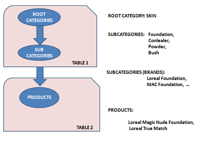 Our Project’s database performs all CRUD ( Create – Read - Delete – Update) actions. The explanation of each database table and their entities are explained below in the formation order. We first created the Category table. It’s formed of a main category and two sub categories. Root category is composed of skin, lips and eyes. Then each parent category is divided into sub categories: (Skin into concealer, powder, foundation), (Lips into lip balm, lipstick, lip pencil), (Eyes into eye pencil, eye shadow, mascara). After that step, each sub category is divided into another sub category. So system works recursively. The parentCategory id of the root category (skin, lips, eyes) are assigned as NULL. In this form, each child category is linked to its parent category by using parentCategory id. A simple display for this system is shown below in order to make the explanation more clear.