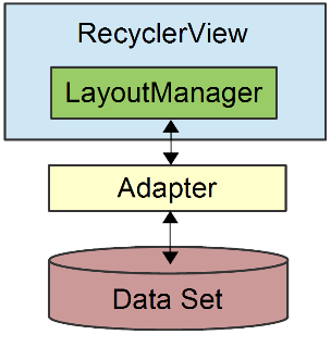 • The LayoutManager can be thought of as the intermediary between the Adapter and the RecyclerView.