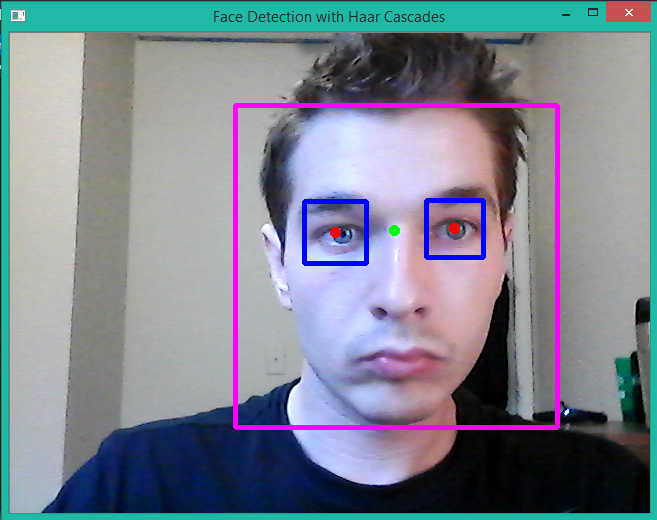 - My program now calculates the centers of the eyes detected and draws a red dot at location of the iris then using these centers it finds the center point between two eyes and draws a ping dot.