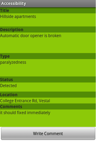 - Report violation : User can report violation by typing Title, Description, Type, Status and Address. If location of violation is in Vestal, application automatically sends e-mail to ssd[at]binghamton.edu