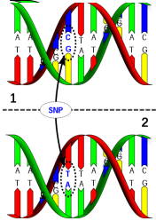 Single nucleotide polymorphisms are DNA sequence variations which occur when a single nucleotide (A, T, C, and G) in the genome sequence is obtained. For example a SNP (bad-gene) may change the DNA sequence TAGGCTAA to TTGGCTAA. For a variation to be considered a SNP, it must occur in at least 1% of the population. The changed gene is represented as bad-gene.