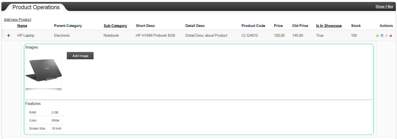 Product table holds product names, its category Id, header, short description, detailed description, product code, price, old price, a flag to show in home page and the number of products as stock. Therefore, while creating a product I use all those and assigned feature and its related contents.
