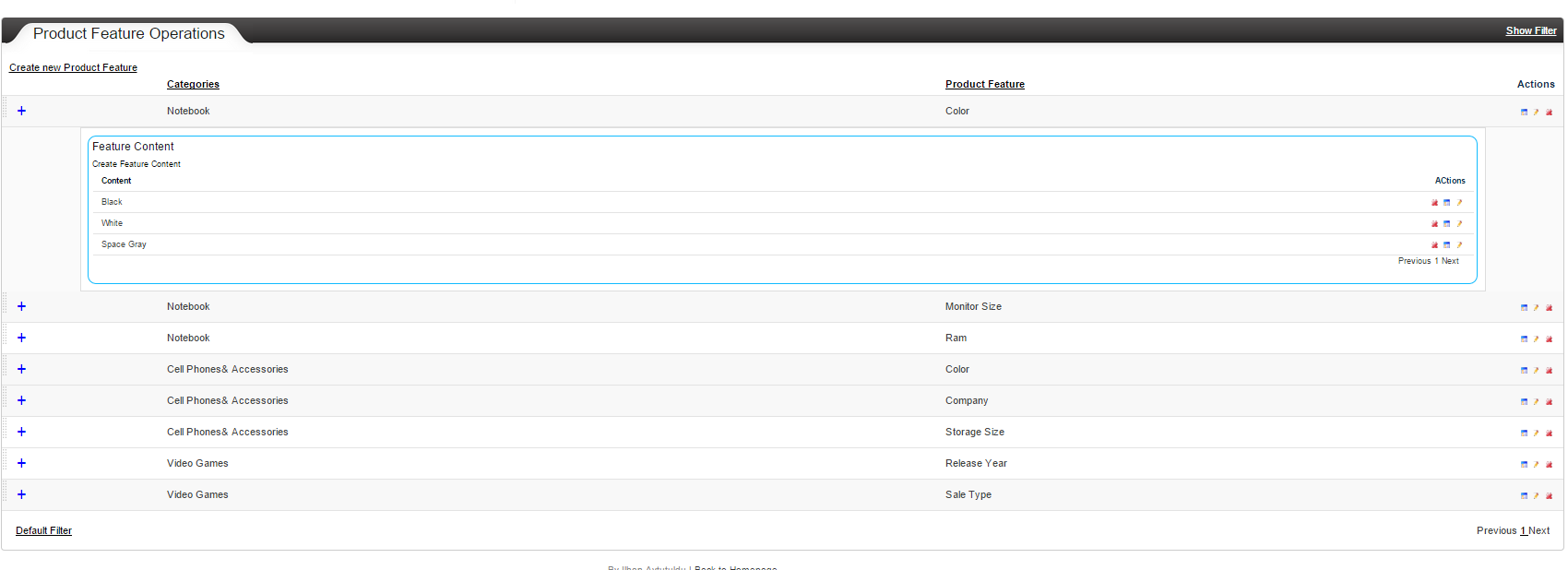 ProductFeatureContent table holds feature Id as a foreign key of feature table, and a feature content name to be assign to the product. For example, Ram as a feature can have 8 Gb or 16Gb.