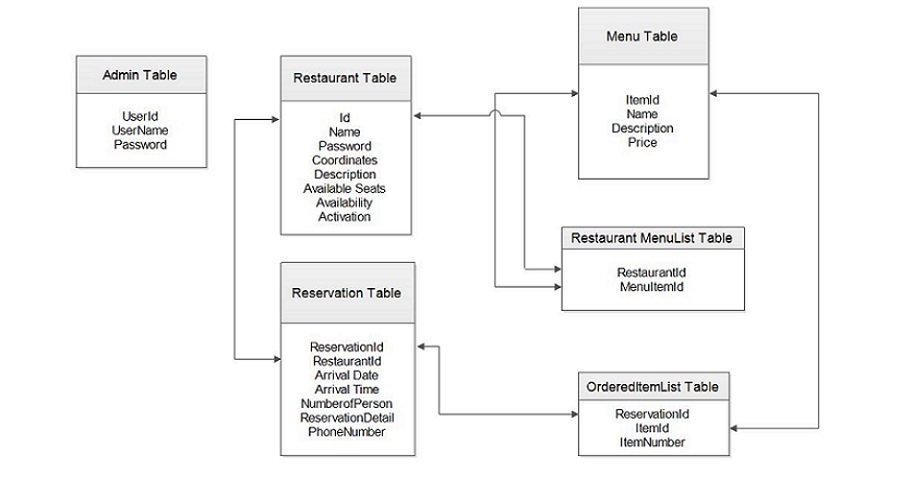 - Restaurant Table : keeps restaurant info with its name, password, coordinates, description, number of available seats, availability and active or inactive status
