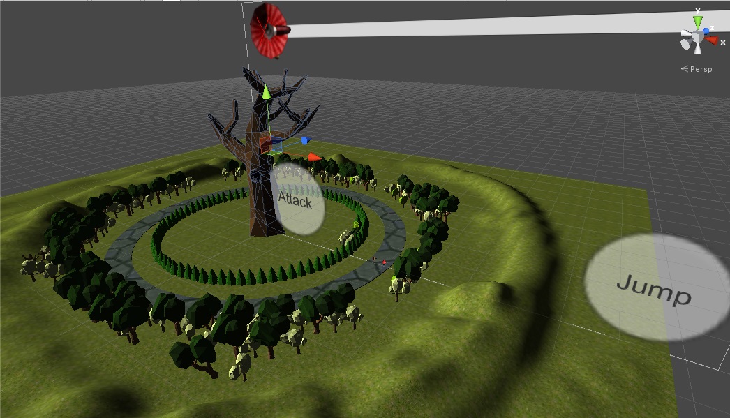 Designed terrain in Unity. -Used one side of a cube as the platform. Environment is built. -Trees, rocks, bushes are added. -Middle tree acts as a game controller. It holds the scripts for the camera and the characters.