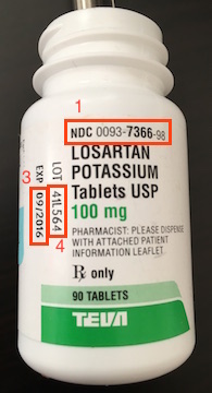 - Manufacturer of the drug: Manufacturers name and adress is stored on the pill bottle. This information inside to return the bottle to the correct adress.