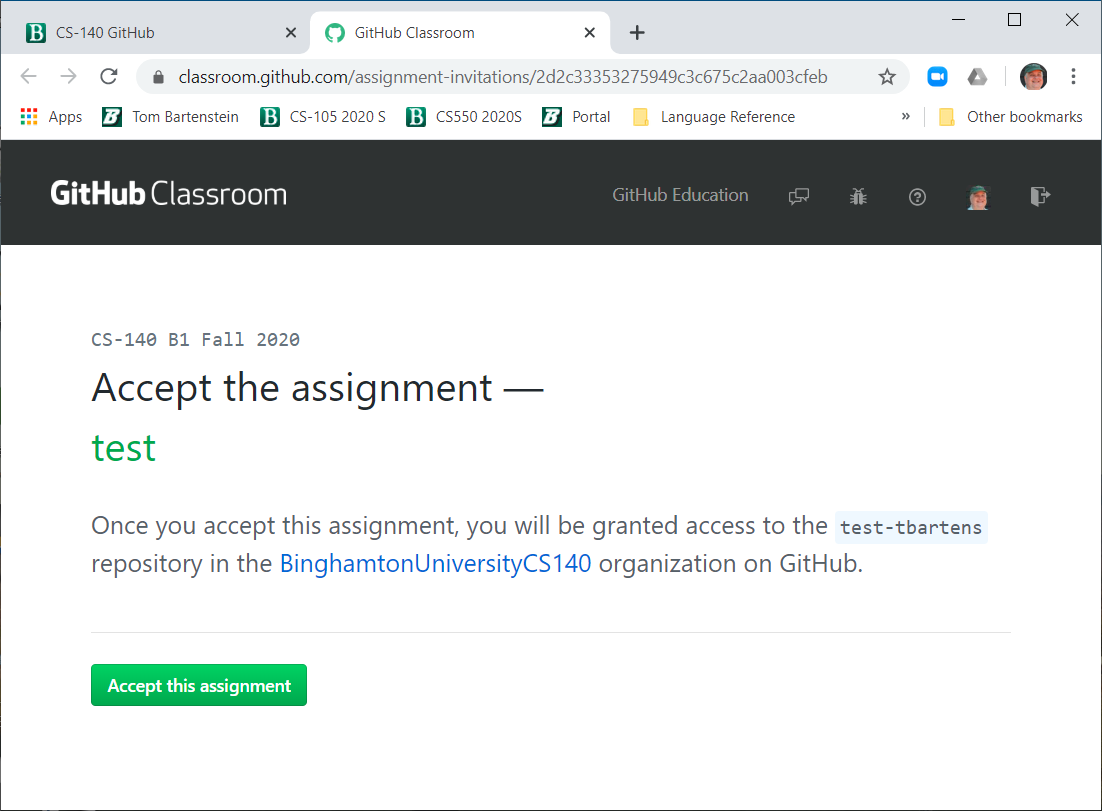 The Professor will create a GitHub Classroom assignment for each homework assignment or lab, and provide the invitation URL for that assignment to you. If you want to try things out, here is a test invitation link(It's probably easiest to right click, and select "Open link in a new tab" so you can flip back to these instructions.)