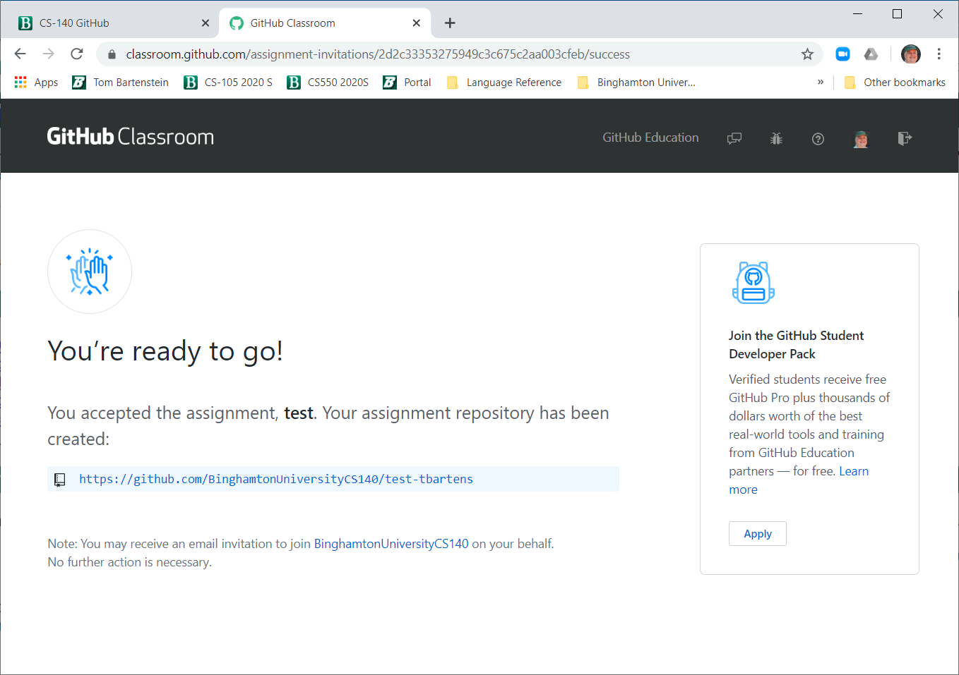 You will see that the "ready to go" screen contains a hyperlink to the web browser view of your master repository. This is the URL associated with your master repository, and it consists of the prefix, https://, followed by the address of the Microsoft GitHub site, github.com, followed by our class organization name, which in this case is BinghamtonUniversityCS140, followed by the repository name itself. You can click on this hyperlink to view your new repository.