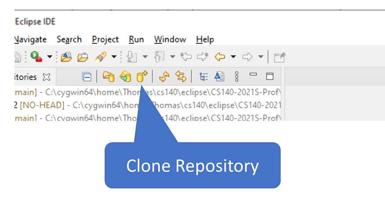 To clone a repository, first copy the URL of the repository you want to clone into your clipboard. Then, open the Git perspective, and click on the and in the repository list window, click on the clone repository icon. This will initiate the Eclipse Clone Repository wizard.